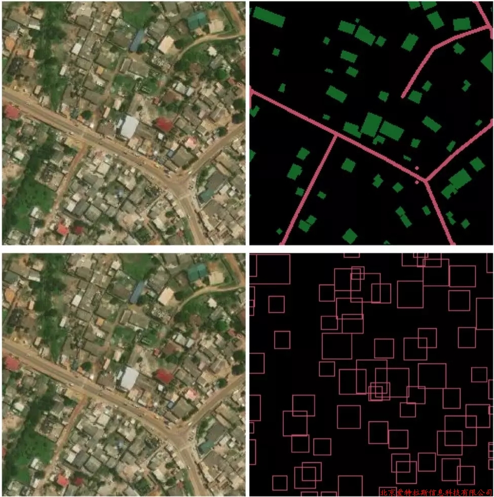 第二排的兩張圖是監(jiān)督學習中的對象檢測訓練數(shù)據(jù)(左圖是衛(wèi)星影像圖,右圖是房子的對象檢測框)。