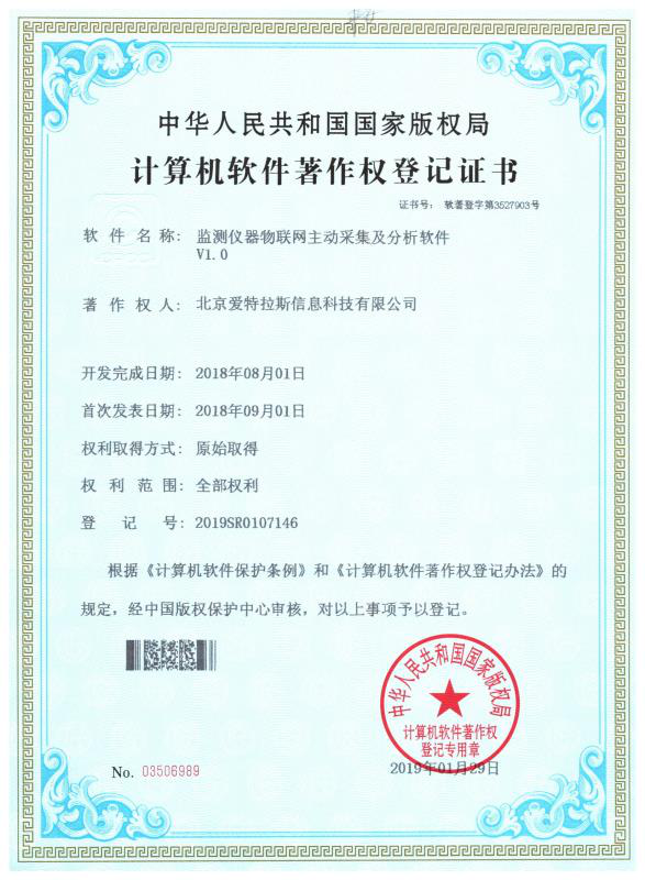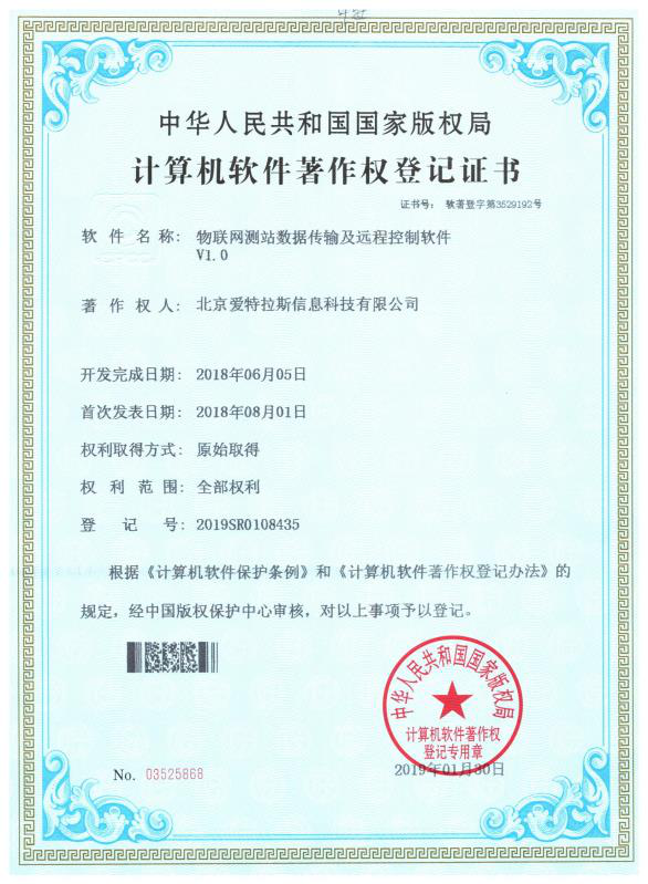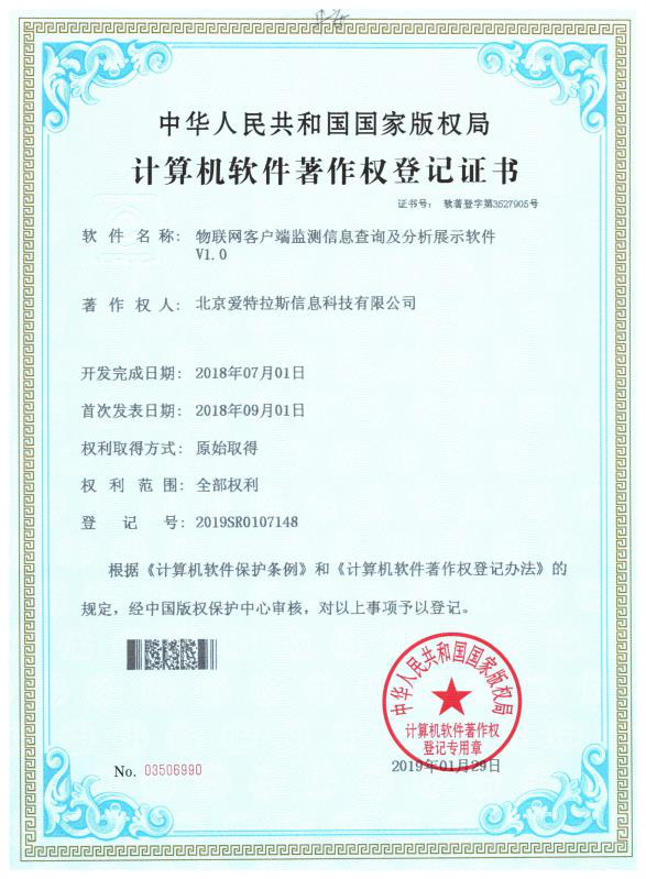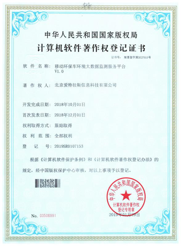 喜訊!我公司又榮獲“移動(dòng)環(huán)保車環(huán)境大數(shù)據(jù)監(jiān)測(cè)服務(wù)平臺(tái)”、“物聯(lián)網(wǎng)客戶端監(jiān)測(cè)信息查詢及分析展示軟件”、“監(jiān)測(cè)儀器物聯(lián)網(wǎng)主動(dòng)采集及分析軟件”、“物聯(lián)網(wǎng)測(cè)站數(shù)據(jù)傳輸及遠(yuǎn)程控制軟件”4項(xiàng)計(jì)算機(jī)軟件著作權(quán)。