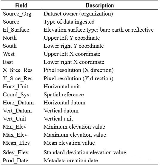 為了便于使用者使用,GMTED2010產(chǎn)品中還包含一份SHP格式的元數(shù)據(jù),通過(guò)該元數(shù)據(jù)可以快速獲取指定區(qū)域GMTED2010產(chǎn)品的概覽信息,元數(shù)據(jù)屬性表如下