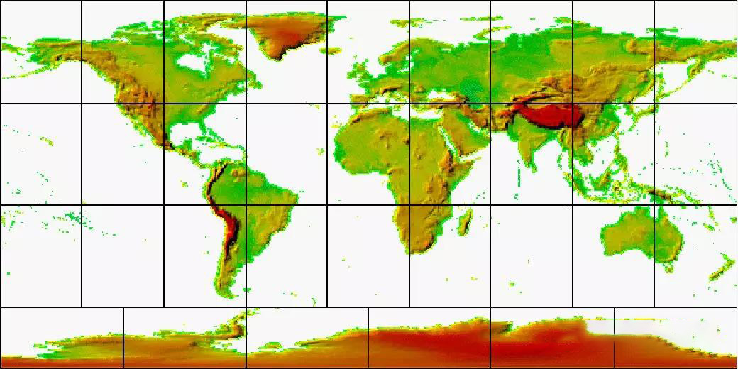 隨著全球各領(lǐng)域研究對(duì)高分辨率DEM數(shù)據(jù)的需求不斷增強(qiáng),同時(shí)新的高程數(shù)據(jù)獲取技術(shù)不斷涌現(xiàn),USGS和NGA合作,十年磨一劍,于2010年共同推出了全球多分辨率地形高程數(shù)據(jù)(Global Multi-resolution Terrain Elevation Data,簡(jiǎn)稱GMTED2010),在全球陸地區(qū)域提供30弧秒、15弧秒、7.5弧秒三種分辨率DEM數(shù)據(jù)。(在格陵蘭島和南極洲只提供30弧秒分辨率DEM數(shù)據(jù),其他陸地區(qū)域均提供相當(dāng)于1Km、500m、250m分辨率的DEM數(shù)據(jù)),下圖是GMTED2010全球30弧秒分辨率平均高程數(shù)據(jù)(-430/8625米)。