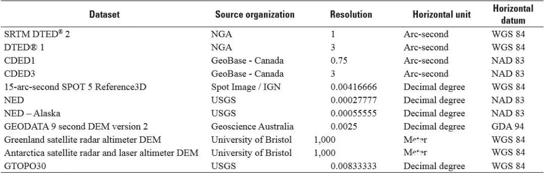 全球DEM數(shù)據(jù)從1988開(kāi)始,經(jīng)過(guò)30余年的發(fā)展,在生產(chǎn)方法、數(shù)據(jù)處理技術(shù)、分辨率、精度、應(yīng)用領(lǐng)域與市場(chǎng)等多個(gè)方面都有了長(zhǎng)足發(fā)展。