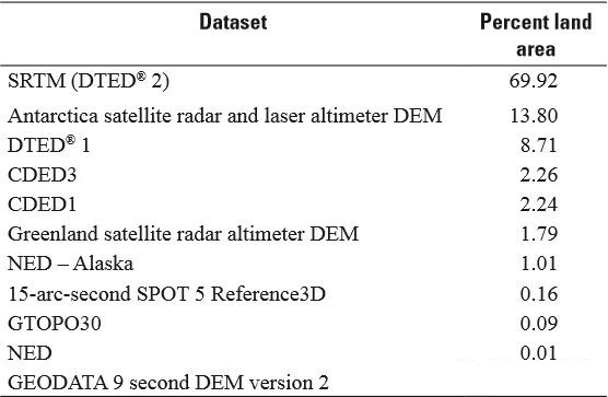 GMTED2010在GTOPO30的基礎(chǔ)上引入了新的高程數(shù)據(jù)源,多達(dá)11種柵格高程數(shù)據(jù)源,最主要的數(shù)據(jù)源NGA SRTM DTED2數(shù)據(jù),約占69.92%,1弧秒分辨率,WGS84坐標(biāo)系統(tǒng),基于EGM96模型的正常高高程;NGA DTED1數(shù)據(jù),約占8.7%,3弧秒分辨率,基于MSL的正常高高程;GMTED2010的數(shù)據(jù)源及其占比如下表