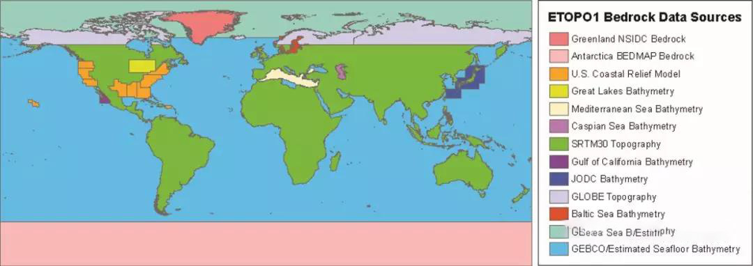 NGDC于2001年、2006年陸續(xù)發(fā)布了ETOPO2的兩個(gè)版本,提供5弧分經(jīng)緯度網(wǎng)格的陸地和海洋高程;2008年8月NGDC發(fā)布了ETOPO1版本,提供全球范圍1弧分經(jīng)緯度網(wǎng)格分辨率的陸渡和海洋高程,分為Ice Surface和Bedrock兩個(gè)版本,兩個(gè)版本差別在于處理南極洲和Greenland區(qū)域數(shù)據(jù)時(shí),Ice Surface給出的是加上冰蓋層之后的高程,Bedrock給出的是巖床的高程。ETOPO1是目前可以免費(fèi)使用的唯一提供海洋高程的全球DEM數(shù)據(jù)。