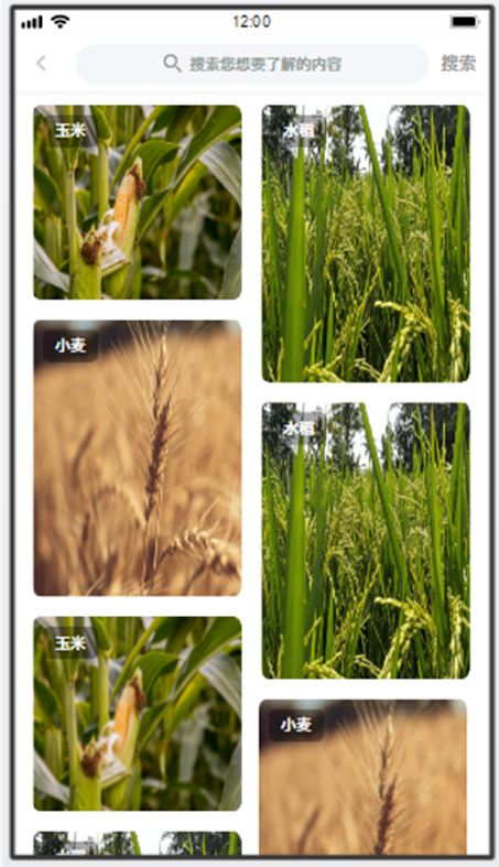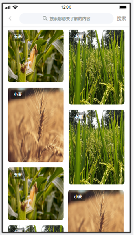 點(diǎn)擊病害庫圖片,進(jìn)入農(nóng)作物分類界面,支持關(guān)鍵字搜索查詢。