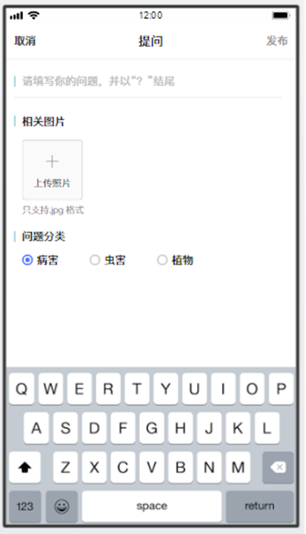 點(diǎn)擊提問按鈕,進(jìn)入提問界面,上傳圖片、填寫問題描述、選擇問題類型,點(diǎn)擊發(fā)布。