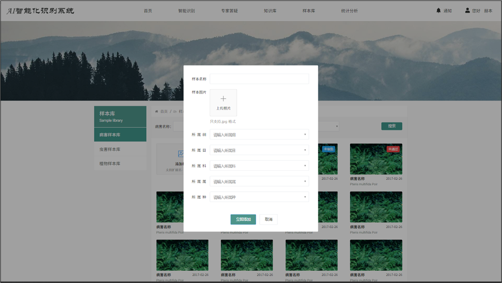 彈出上傳樣本界面,填寫樣本名稱及其綱、目、科、屬、種,上傳圖片,點(diǎn)擊“立即添加”按鈕,添加樣本。