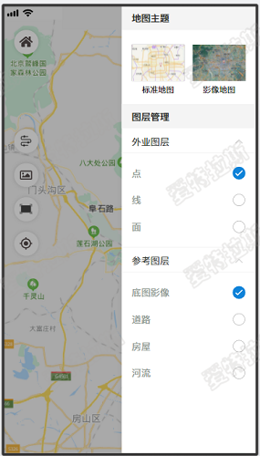 圖層管理模塊主要包含外業(yè)圖層管理和參考圖層管理,外業(yè)圖層主要包含點(diǎn)、線、面、標(biāo)注圖層的顯示開關(guān),參考圖層可以控制參考影像數(shù)據(jù)、參考矢量數(shù)據(jù)的顯示開關(guān);軟件自帶全國(guó)主題矢量和影像地圖提供用戶參考。