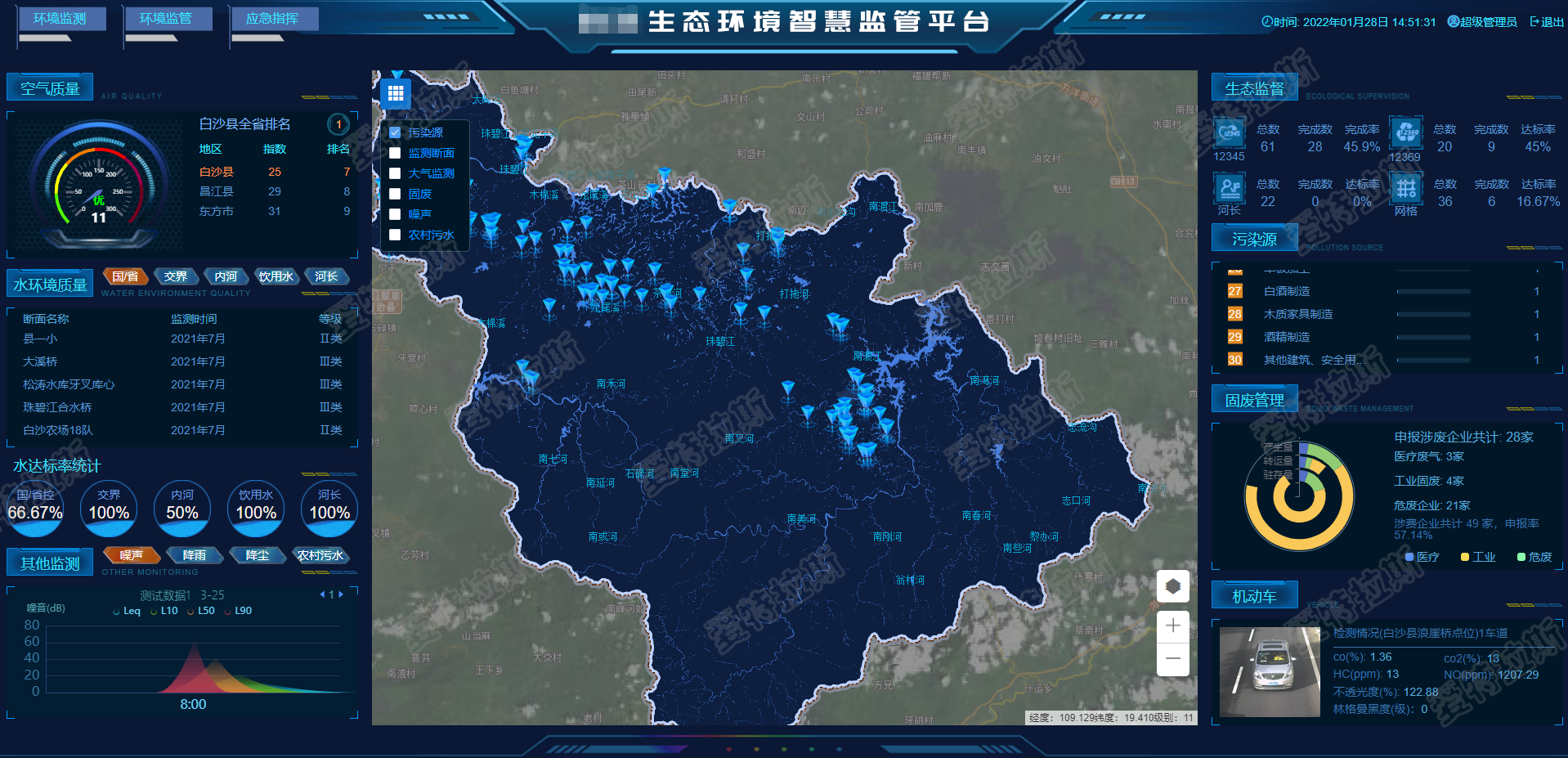 對資源整合分析實現生態(tài)環(huán)境一張圖。通過監(jiān)測提供的數據可以在此頁面提供可視化的生態(tài)環(huán)境指標、列表、統(tǒng)計圖等,并且可以在地圖上顯示出污染源、水、大氣、固廢、噪音農村污水的具體點位和詳情描述。通過監(jiān)管提供的數據可以在此頁面展示12345、12369、河長、網格的任務數和完成率和達標率。 |