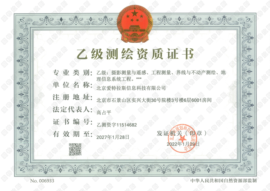2022虎年剛剛開工,喜訊傳來,愛特拉斯收到了由北京市規(guī)劃和自然資源委員會頒發(fā)的乙級測繪資質(zhì)證書。資質(zhì)證書的專業(yè)類別包括攝影測量與遙感、工程測量、界線與不動產(chǎn)測繪、地理信息系統(tǒng)工程等方面。