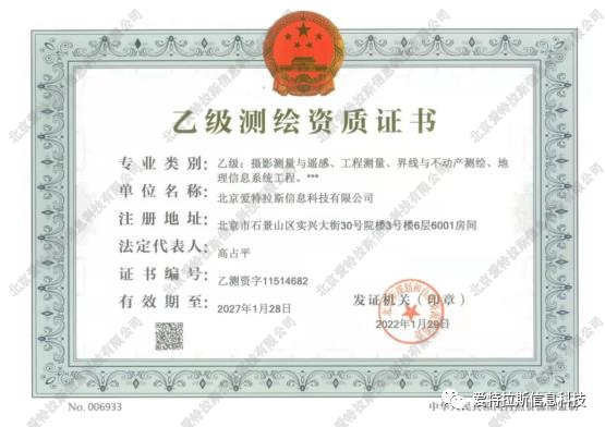 2022年,北京愛特拉斯信息科技有限公司喜獲乙級測繪資質,含攝影測量與遙感、工程測量、界限與不動產測繪、地理信息系統(tǒng)工程。明年升級甲級測繪資質。