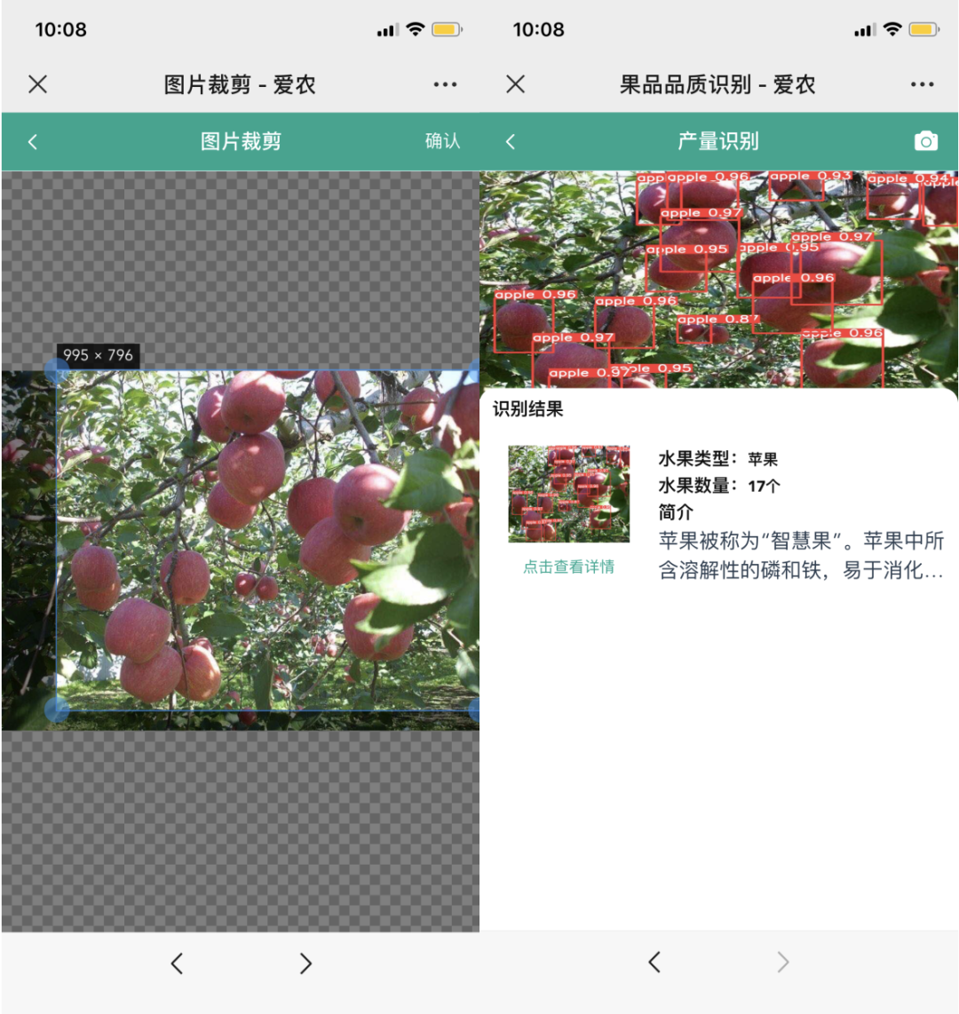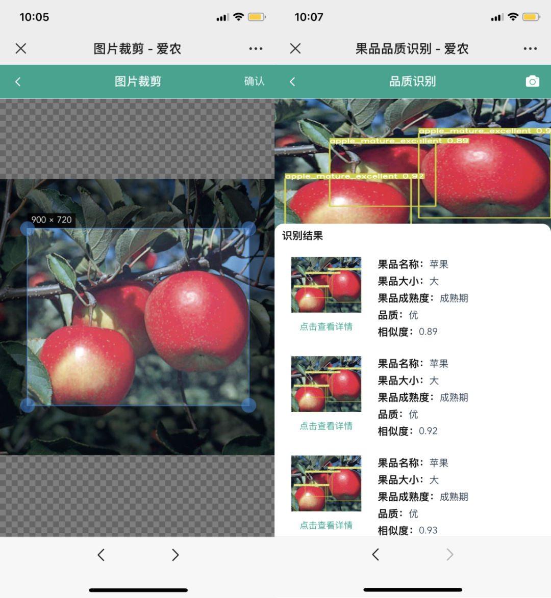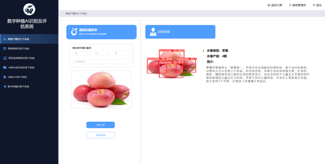 該項(xiàng)目是2022年開發(fā)的數(shù)字種植業(yè)數(shù)據(jù)服務(wù)平臺(tái)?;趷厶乩股疃葘W(xué)習(xí)算法,系統(tǒng)建設(shè)了AI識(shí)別及評(píng)估子系統(tǒng)、果樹病害識(shí)別子系統(tǒng)、果品品質(zhì)等級(jí)識(shí)別子系統(tǒng)、AI樣本庫及知識(shí)庫子系統(tǒng)等多個(gè)果樹、果園AI識(shí)別識(shí)別系統(tǒng),解決了果園產(chǎn)量預(yù)估困難、果樹病蟲害監(jiān)測識(shí)別難的問題。