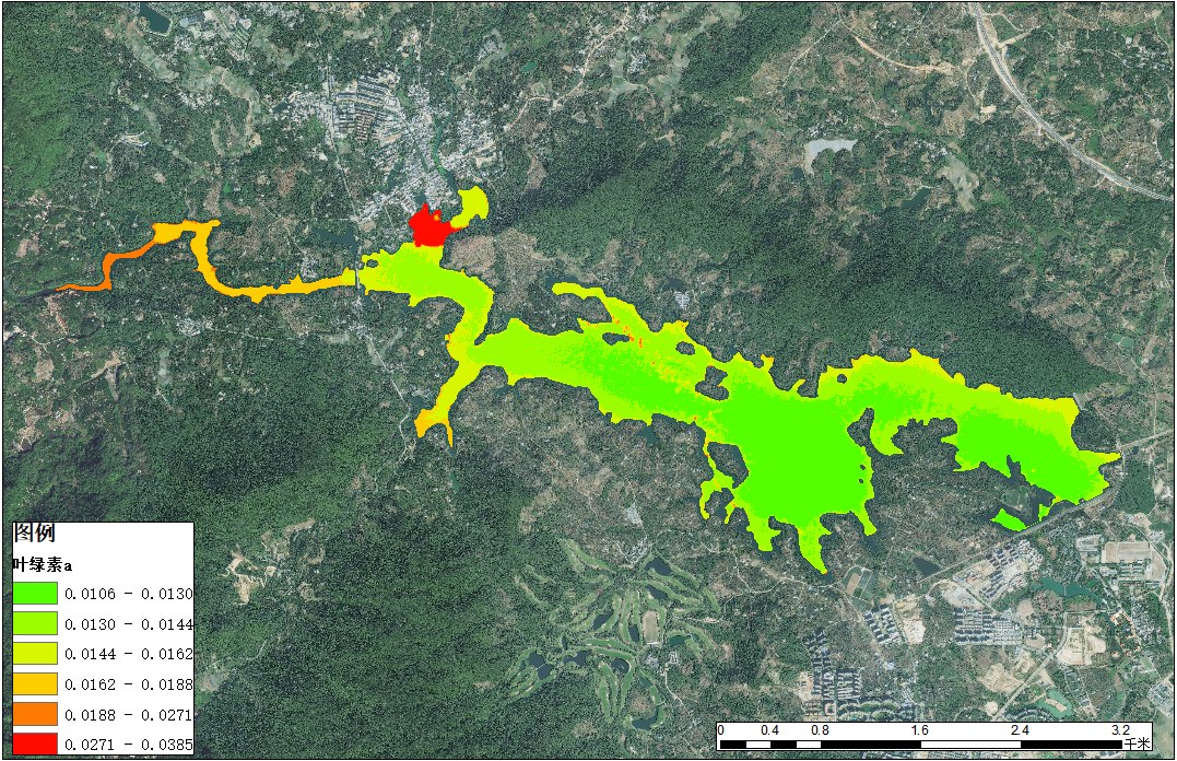 輸入經(jīng)過(guò)預(yù)處理的多光譜影像數(shù)據(jù)及模型確定步驟生成的模型,進(jìn)行遙感數(shù)據(jù)反演,最終得到單因子水質(zhì)反演成果。