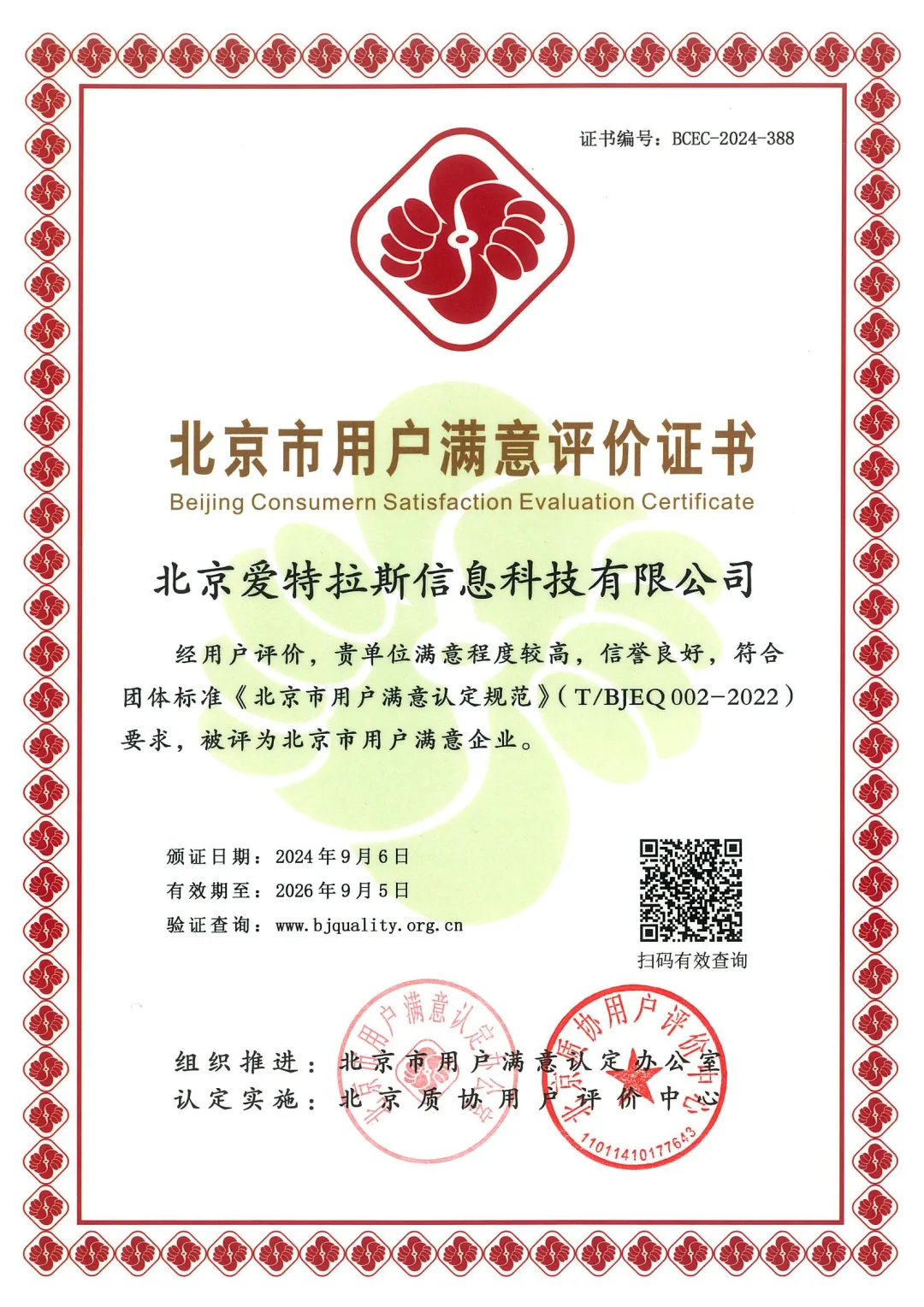 近日,北京市社會企業(yè)質(zhì)量協(xié)會公布2024年第五批(總第四十一批)“北京市用戶滿意企業(yè)”名單。根據(jù)《北京市用戶滿意度認(rèn)定規(guī)范》相關(guān)要求,經(jīng)過企業(yè)自愿申報、資料初審、第三方滿意度調(diào)查、專家組評審、公示公告,北京愛特拉斯信息科技有限公司最終被北京質(zhì)協(xié)用戶評價中心認(rèn)定評選為“北京市用戶滿意企業(yè)”。標(biāo)志著業(yè)界對愛特拉斯技術(shù)創(chuàng)新、產(chǎn)品研發(fā)、和客戶滿意度等多方面能力的高度認(rèn)可。此次獲評,為愛特拉斯在今后優(yōu)化服務(wù)體系,提升用戶口碑方面樹立了信心,指明了方向。