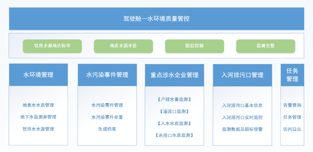 該平臺依據(jù)業(yè)務(wù)的監(jiān)管手段及責(zé)任主體劃分為駕駛艙、水環(huán)境質(zhì)量管控、水環(huán)境管理(包含地表水、地下水、水源地)、水污染事件管理、重點涉水企業(yè)管理、入河排污口管理、及任務(wù)管理幾大板塊。